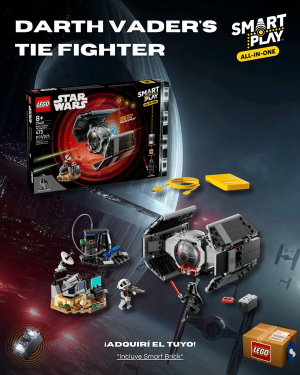 Un set interactivo All-in-One de SMART Play™ con el TIE Fighter™ de Darth Vader. Incluye SMART Brick, SMART Minifigure, SMART Tag y cargador para activar sonidos, luces y respuestas durante el juego.