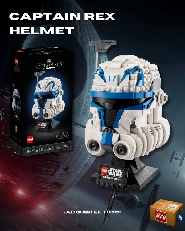 Una réplica construible del casco del Capitán Rex, Comandante Clon de la Legión 501. Incluye base con placa de nombre y detalles característicos del casco, pensada como pieza de exhibición para fans de Star Wars: The Clone Wars™.